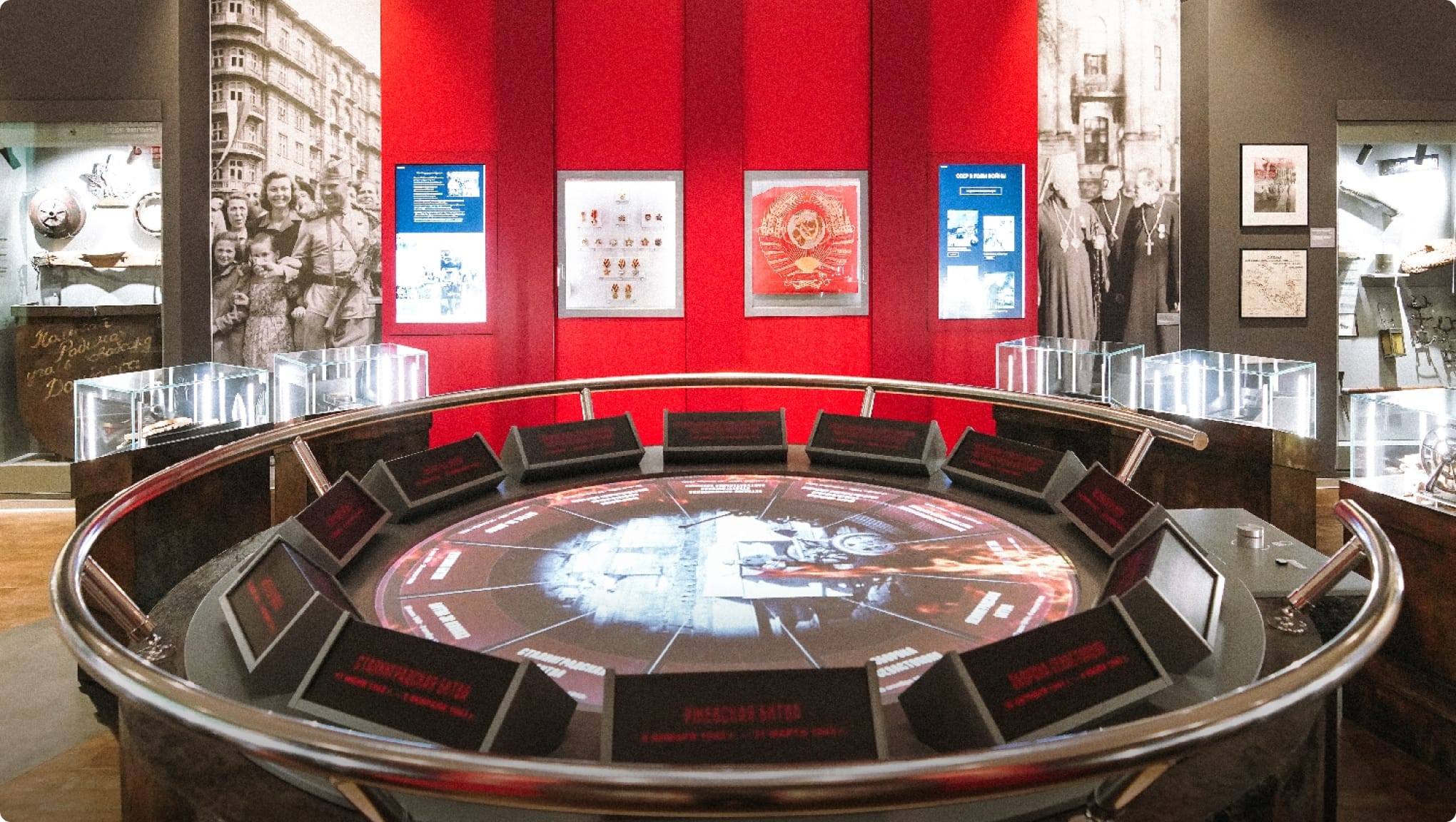 В рамках проекта были реализованы интерактивные карты, мультимедийные столы, проекционные решения и визуальные сценарии. Студия 8Vision разработала цифровой контент, спроектировала пользовательские интерфейсы и обеспечила интеграцию мультимедийных решений в архитектуру экспозиции, сохранив целостность пользовательского опыта.